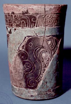 Vaso estucado con rojo y verde. Tiene pared vertical y base plana. Parece ser pareja del vaso No. 0655. Tiene una banda de pseudoglifos debajo del borde y de una banda de estuco rojo. Los páneles son diagonales y parecen representar un reptil. Hay páneles decorados sólo con estuco rojo-verde. Cerca de la base hay…