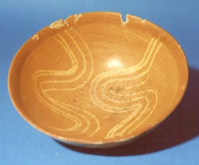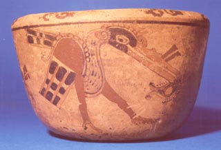 Cuenco policromado de pared vertical y base convexa. Tiene diseños hechos en pintura roja en el borde. El diseño principal consta de 3 representaciones de aves acuáticas que tienen un pez en el pico.