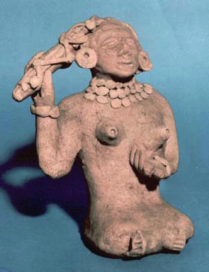 Figurilla que representa a una mujer sentada con las piernas cruzadas. Con la mano izquierda se está agarrando el pelo y en la mano derecha sostiene otro objeto. Tiene orejeras redondas y un collar de cuentas redondas. Hay un agujero detrás del hombro derecho.