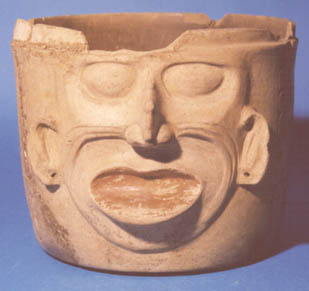 Cuenco con efigie antropomorfa. Tiene pared vertical, moldura labial y base plana. Esta vasija se encuentra relacionada estilísticamente con la No. 0718. La vasija representa la parte inferior de la cara de un viejo, tiene el labio inferior protuburerante y pintado de rojo. Además, hay una serie vertical de 3 glifos a los lados de…