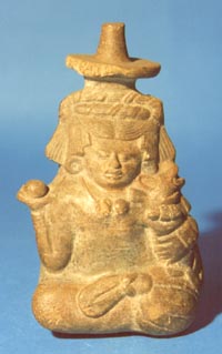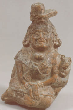 Figurilla-silbato que representa a una anciana con las piernas dobladas hacia el lado derecho y las manos sobre las rodillas. Parece que tiene amarrado un perro en el hombro izquierdo. El tocado parece ser un sombrero de copa.