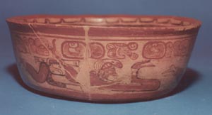 Cuenco policromado de pared recto-divergente y base plana. Tiene una banda roja en el borde. Debajo, en la parte exterior hay una banda de 8 glifos delineados con negro seguidos de 9 glifos delineados en rojo. Debajo hay 3 figuras reclinadas que tienen distinto tocado cada una. El interior de la vasija está decorado por…