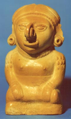 Figurilla de céramica Tiquisate, femenina sentada con las piernas cruzadas. El peinado es distintivo, camino en medio y dos trenzas. La mujer está ataviada con collar, pulseras. orejeras y nariguera. Tiene el pecho descubierto y en cada hombro tiene 9 óvalos.