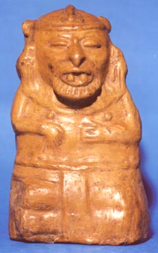 Figurilla antropomorfa que representa a un hombre sentado con las piernas cruzadas. El hombre tiene barba y se notan los dientes incisivos en su boca abierta. Parece que los ojos se encuentran cerrados.