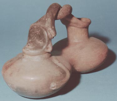 Vasija de doble cuerpo con efigie zoomorfa (mono). La pared de las vasijas es curvada y la base es ligeramente cóncava. Las vasijas están unidas por un asa o puente en forma de serpientes enrrolladas. Una de las vasijas tiene la efigie de mono y la otra tiene cuello cilíndrico.