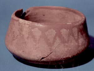 Cuenco de pared curvo convergente y base cóncava. En el borde y en el quiebre de pared-base hay bandas horizontales rojas. Entre estas bandas se observan una serie de líneas entrecruzadas que forman rombos.