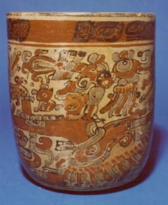 Vaso policromado de pared vertical y base plana. Banda negra en el borde. Debajo hay una banda de color rojo que contiene una Secuencia Primaria Estándar de glifos delineados en negro. La escena principal presenta a una deidad muy adornada y que tiene características de jaguar (i.e. las garras). Varios glifos se observan en toda…