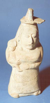 Figurilla-silbato de base plana. Representación de una mujer cargando a un niño en sus brazos.