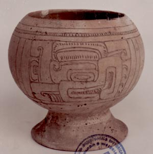 Cuenco de pared curvo convergente, borde redondeado, base pedestal. Decoración: dos páneles que presentan diseños de rostro inciso de serpiente de perfil.