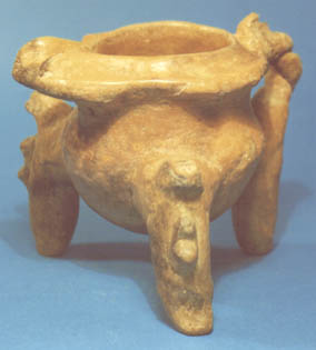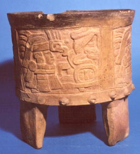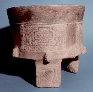 Cuenco trípode de pared vertical, base ligeramente convexa y soportes rectangulares (estilo teotihuacano). Decoración incisa y relieve. Tiene 4 páneles que representan a 2 personajes a los lados de un diseño cruciforme. En la parte inferior cerca del borde hay una serie de cabecitas en relieve. Soportes decorados por incisión.