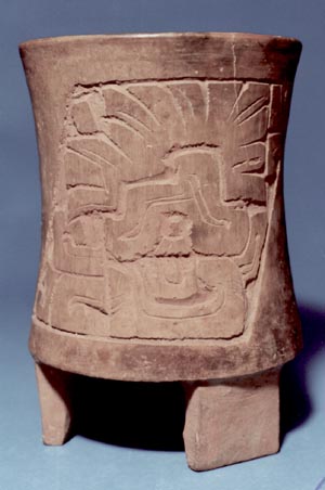 Vaso cilíndrico trípode, de pared curvada hacia afuera, base plana y soportes rectangulares huecos. Decoración incisa gruesa y excisa. 2 páneles diagonales que representan una cabeza de serpiente mitológica. Líneas incisas medias sobre la serpiente.