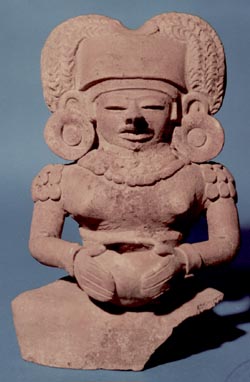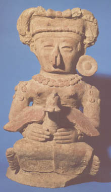 Fragmento de urna funeraria, talvez asa; tiene base pedestal. Representa a una mujer sentada que tiene un ave sobre las piernas.