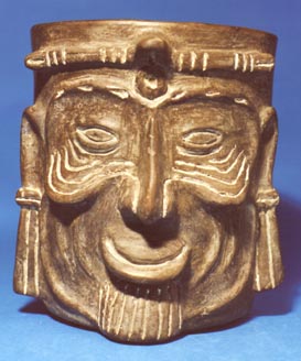 Vaso cilíndrico con efigie antropomorfa de pared vertical y base plana. La efigie está modelada a un lado de la vasija. Está decorada por modelado y líneas incisas gruesas. Se aplicó pintura blanca sobre las incisiones. La efigie representa a un hombre viejo (dios del Fuego, Huehueteotl?).