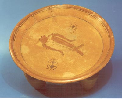Plato tetrápode de pared divergente, con moldura basal, base plana y soportes cilíndricos. En el interior se observa la representación de un pez y a los lados superior e inferior se encuentran dos insectos. El borde del plato está pintado de rojo y hay dos bandas delgadas de color negro debajo. La moldura está pintada…