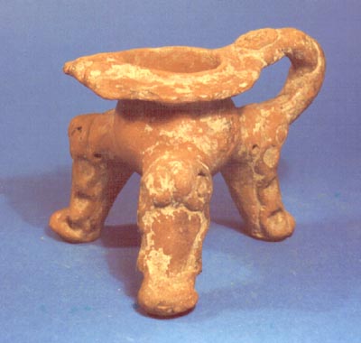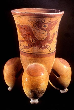 Vaso tetrápode, de pared ligeramente divergente y soportes mamiformes. Representación de un venado en posición de movimiento. Los soportes tienen pintado un círculo rojo en la parte superior. Estilo Protoclásico.