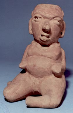 Figurilla humana con las rodillas dobladas y los brazoas a los lados. Es un jorobado, modelado en estilo naturalístico con nariz y labios prominentes. Lleva un collar de cuentas redondas.