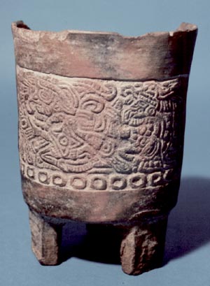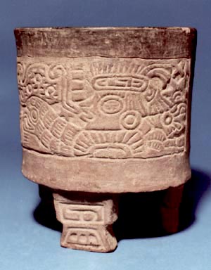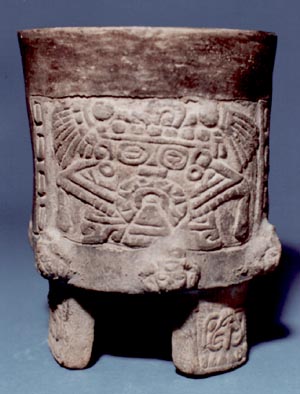 Vaso trípode de pared vertical, base plana y soportes en forma de almeda (talud-tablero) estilo teotihuacano. La decoración es incisa e ilustra la cabeza de Tlaloc de perfil descansando sobre un pájaro. Los soportes muestran el símbolo de Tlaloc: espiral en el tablero y 3 puntos en el talud.