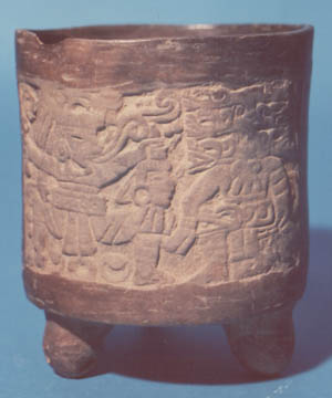 Vaso trípode, de pared vertical, base plana y soportes semiesféricos. Decoración incisa que representa a 2 personajes y uno de ellos está sosteniendo la cabeza del otro.