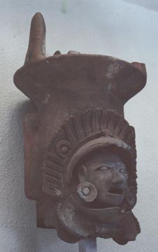 Fragmento de incensario tubular. Tiene tres picos en la parte superior y dos aletones, uno en cada lado. Representación de un guerrero con tocado de ave. Decoración hecha a base de pastillaje.