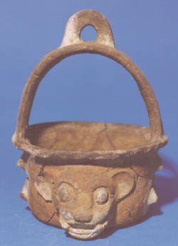 Incensario en forma de cuenco estilo canasta de mercado con efigie zoomorfa (jaguar). El asa se extiende de un lado a otro y en la parte superior hay un anillo, para colgar el cuenco de una pita.