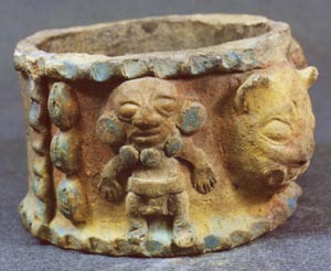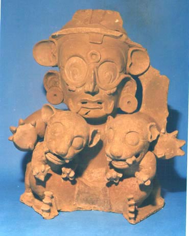 Fragmento de tapadera de urna funeraria con efigies antropomorfas y zoomorfas. La efigie antropomorfa representa a la deidad solar y las zoomorfas a dos jaguares, uno de cada lado de la deidad.