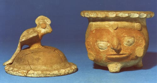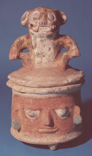 Urna miniatura completa. Cuenco de pared curvada y base curva con 3 soportes sólidos; tiene una efigie humana con la nariz muy pronunciada. La cara está cubierta con pintura roja. La tapadera es convexa y tiene como asa un quetzal.