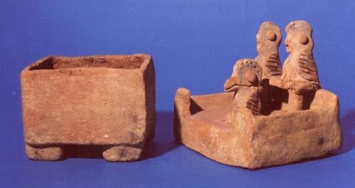 Urna miniatura completa. Cuenco de forma rectangular con pared vertical y base plana con 4 soportes rectangulares. La tapadera es de forma rectangular (14×11 cm) y tiene en la parte superior 3 quetzales, 2 sentados en una banca y el otro en el suelo.