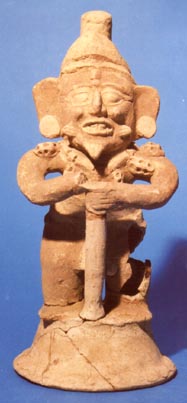 Tapadera de urna miniatura con asa antropomorfa. El asa representa a un hombre parado que lleva un bastón entre las manos y un mecapal con el cual sostiene un cilindro con decoración incisa. El personaje tiene barba pintada de blanco.