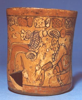 Vaso de estilo Chamá con pared ligeramente divergente y base plana. El diseño principal está enmarcado por una banda roja y otra negra, en el borde y base. Debajo del borde, alrededor del vaso hay una serie de glifos. En la escena principal se puede observar al dios N que lleva un caracol en la…