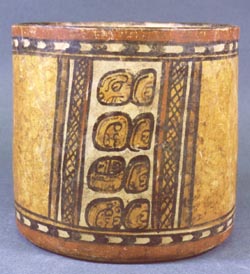 Vaso de estilo Chamá con pared vertical, unión pared-base curva con acanaladuras verticales y base plana. Hay 2 páneles diagonales que presentan dos series de 6 glifos cada una. Estas están enmarcadas por bandas negras (continua y punteada) y una banda blanca. Entre los páneles se observan una serie de líneas de color rojo pintadas…
