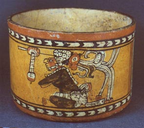 Cuenco policromado de pared vertical y base plana. Representa a dos personajes sentados, uno con las manos cruzadas y el otro con las manos apoyadas en el suelo. Se encuentran separados por dos páneles de tres glifos cada uno, todo enmarcado por dos bandas de flechas negras sobre blanco (borde/base).
