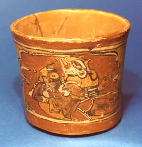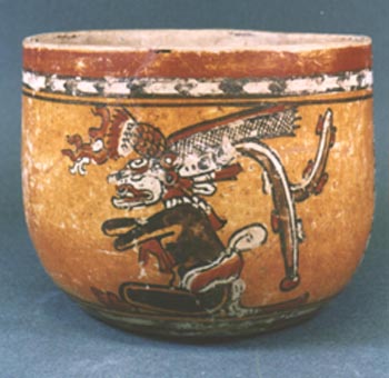 Cuenco policromado de pared curva y base plana. Representación de dos personajes con máscara de felino y el cuerpo pintado de negro. Los personajes se encuentran sentados. Están separados por dos páneles de 3 glifos cada uno. Banda de flechas negras en borde y base.