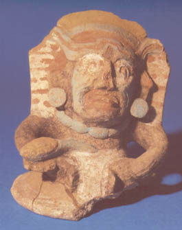 Tapadera de urna miniatura con base redonda. Representa a un personaje antropomorfo sentado y con las manos en la cintura. Lleva el taparrabos y la cara pintadas de blanco; las orejeras, collar y tocado pintados de celeste.