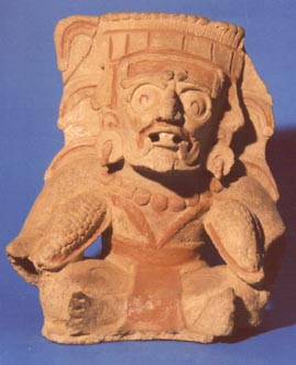Fragmento de tapadera de urna, personaje sentado con las piernas cruzadas y los brazos ligeramente flexionados a los lados del cuerpo, sosteniendo una mazorca de maíz en cada brazo las cuales son apoyadas sobre los hombros, ojos redondos con iris en forma de bastón, nariz aguileña con representación de arrugas, volutas a los lados de…