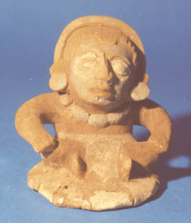 Tapadera de urna miniatura de forma cónica y con efigie antropomorfa. Representa a un personaje sentado con las piernas cruzadas y manos sobre muslos. Tapadera de pieza MPV0916.