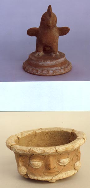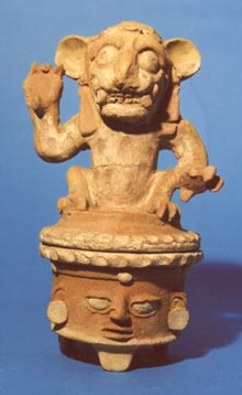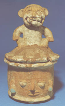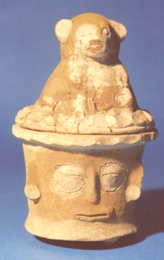 Tapadera y cuenco de urna miniatura. La tapadera de base redonda y con efigie zoomorfa (jaguar). El cuenco es de pared vertical y base plana con 3 soportes cónicos, tiene efigie antropomorfa. El jaguar de la tapadera funciona como asa y tiene la parte frontal pintada de blanco.