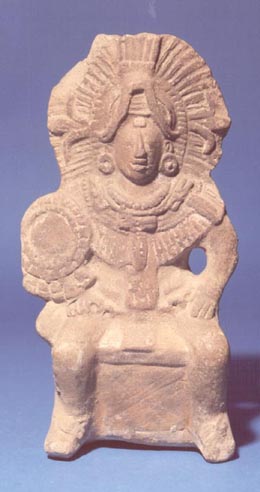 Figurilla antropomorfa de guerrero sentado sobre trono decorado con bandas cruzadas.