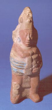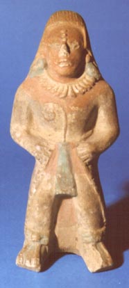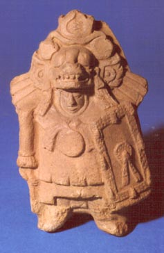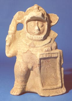 Figurilla antropomorfa de guerrero con tocado en forma de jaguar. Lleva escudo rectangular. No tiene pintura.