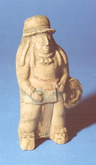 Figurilla antropomorfa, lleva un sombrero y sostiene con su mano izquierda un abanico.