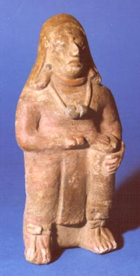 Figurilla antropomorfa de músico. Flauta o trompeta larga debajo de brazo derecho.