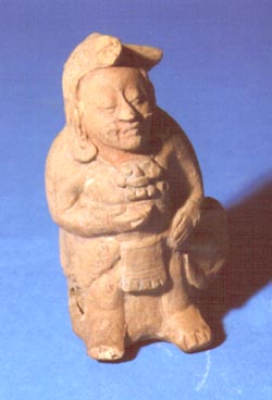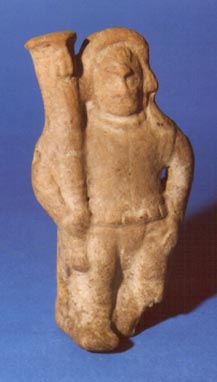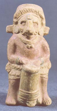 Figurilla-silbato antropomorfa con base plana. Representa a un músico que en su mano izquierda sostiene un tambor.