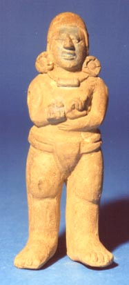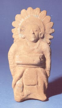 Figurilla antropomorfa con tocado de plumas y yugo en cintura. Posible jugador de pelota.