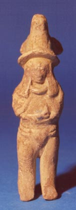 Figurilla antropomorfa. Tocado con 2 picos y lleva un objeto redondo en mano izquierda.