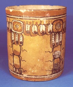 Vaso con pared recta y base plana. Diseño enmarcado por dos bandas blancas (borde y base); 4 cuadros unidos por otros diseños.