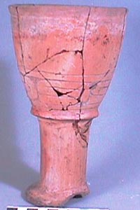 Tambor color naranja, labio plano, borde engrosado, cuerpo de silueta compuesta, pared superior curvo convergente, pared inferior cilíndrica, con borde basal evertido, labio redondeado, moldura medial en la uníon de la pared superior y su parte inferior. Decoración: una banda con diseños incisos en forma geométrica. Tiene restos de pintura roja.