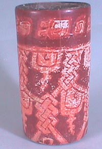 Vaso policromo (rojo, negro y naranja), labio redondeado, pared recta, base plana. Decoración: labio y borde interior pintado de negro,debajo del borde una banda de glifos rojos naranjas delineados en rojo sobre un fondo rojo, debajo una serie repetitiva de diseños “pop” y un diseño posiblemente de caracol, en color rojo delineado en rojo sobre…