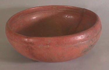 Cuenco bicromo (café, rojo), labio redondedo, pared curvo convergente, base plana. Decoración: borde pintado de rojo, debajo del borde una acanaladura, alrededor del cuenco.