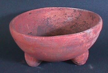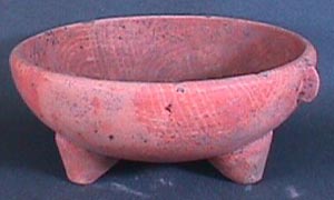 Cuenco trípode, tipo Usulután, labio redondeado, pared curvo convergente, soportes cónicos. Decoración: dos aplicaciones equidistantes, debajo del borde.