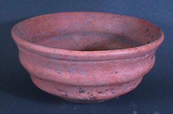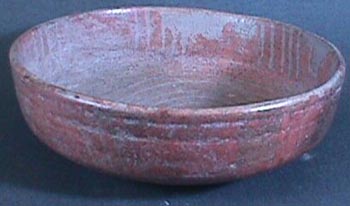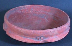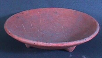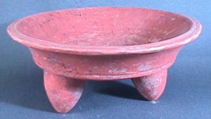 Plato trípode, tipo Usulután, labio redondeado, borde evertido con acanaladura, pared curvo divergente, soportes cónicos. Decoración: una acanaladura debajo del borde y una arriba de la base.