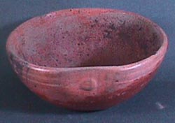 Cuenco rojo, labio redondeado, borde evertido, pared curvo convergente, base convexa. No presenta decoración. Posee cinabrio en el interior del plato.
